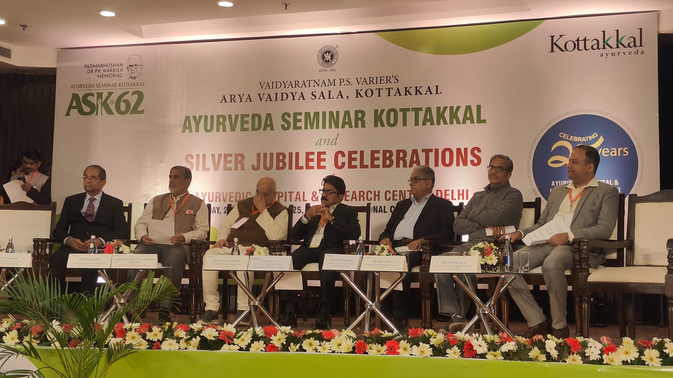 Former Ambassador Prof. Venu Rajamony inaugurated the silver jubilee celebration in the presence of Dr. P.M. Varier, Managing Trustee and Chief Physician, Arya Vaidya Sala, Padmabhushan Vd. Devendra Triguna, President of the All India Ayurvedic Congress,Shri K. Raghunath, President of Delhi Malayali Association (DMA), Dr. Sujith S. Warrier, Trustee and Factory Manager at Arya Vaidya Sala, Dr. Prasanth P., Superintendent and Senior Medical Officer at AH&RC Delhi, Arya Vaidya Sala, Kottakkal, and Dr. Jithesh M.K., Senior Medical Officer Quality Assurance at Arya Vaidya Sala.