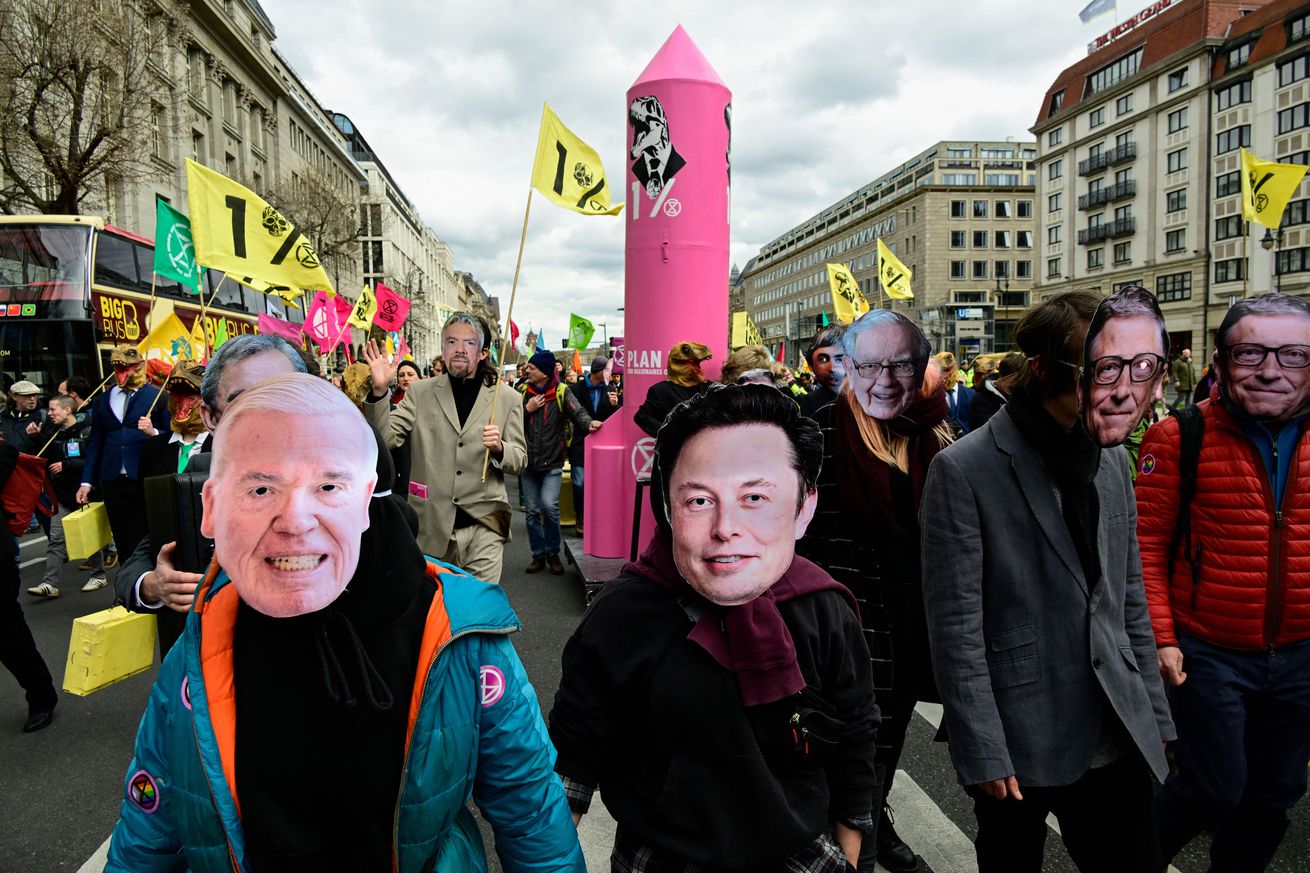 Climate activists of Extinction Rebellion wearing masks of company CEOs including X’s Elon Musk take part in a demonstration in Berlin, Germany, on April 13th, 2023...